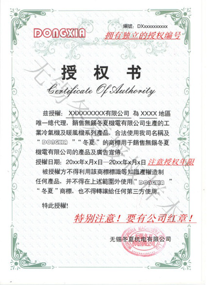 (1) 只有从经过我公司授权的经销点购买的机器才为“DONGXIA”冷气机,并可享受退换货及保修服务,其他非我公司授权的渠道所购买的机器皆不能保证是全新、机器且无法享受任何服务。我公司授权的经销处可从公司官方网站(www.winter-summer.com)查询,购买时务必要求对方出示公司公司正规授权文件。