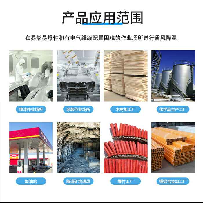 在易燃易爆性和有电气线路配置困难的作业场所进行通风降温。